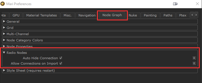 Connection Building when importing Node Networks through the Right Mouse Click / Edit / Import Nodes or File / Session / Options in Mari.