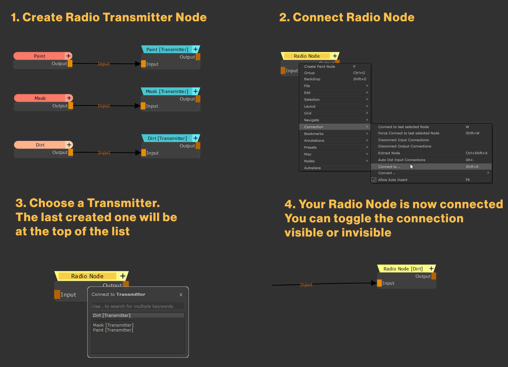 The Radio Transmitter Node is a custom node that can be called by a Radio Node from anywhere inside your current Nodegraph via the Right Mouse Click / Connection / Connect to .  Option (Shift+R) Menu Option.