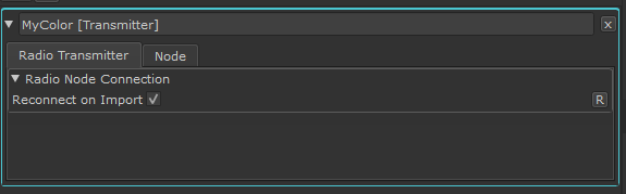 Radio Transmitter Nodes contain a checkbox (on by default) to determine if they are accepted nodes for the Automatic Reconnection of Radio Nodes on Import